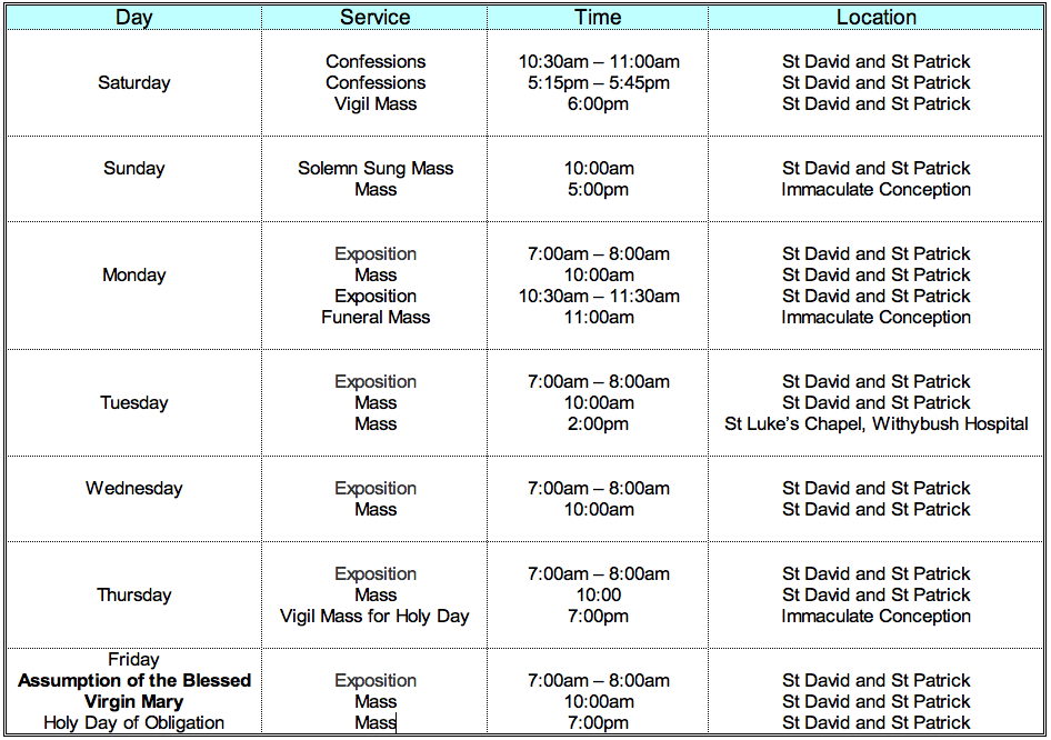Friday is the Solemnity of the Assumption of the Blessed Virgin Mary and it’s a Holy Day of Obligation: A day when Catholics are asked to show their commitment to the faith by coming to Mass. Mass times in the parish can be found here. It’s also a day when feasting is to be encouraged and so the normal practise of abstaining from meat need not be observed.