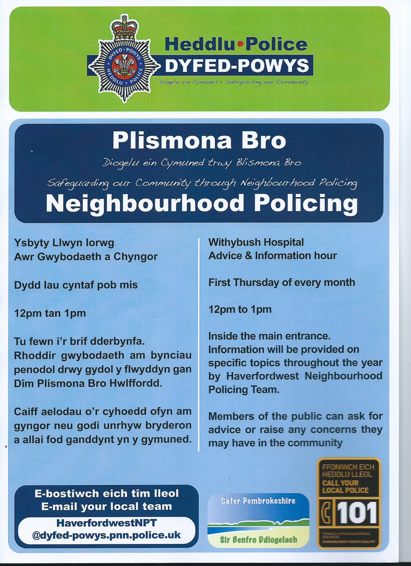Dyfed-Powys Neighbourhood Policeing Team, Mid and West Wales Fire and Rescue Service and Withybush Hospital are coming together to offer a monthly, open surgery located at the front door of Withybush Hospital. Any member of the public can come to ask questions, obtain advice and to raise any concerns which they have regarding local police, fire and community issues. This advice and information hour will take place from 12noon to 1pm on the first Thursday of every month.